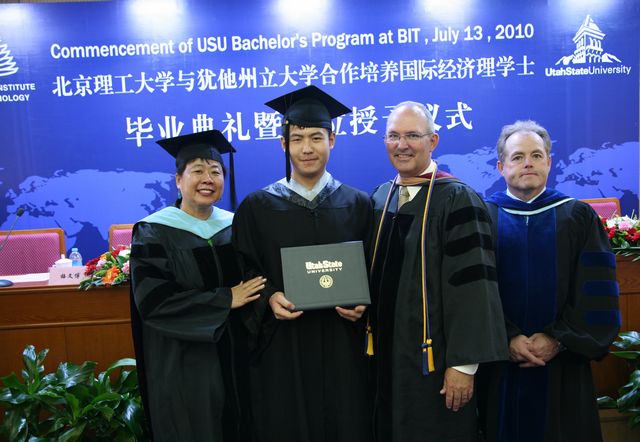 2010年7月13日下午,北京理工大学与美国犹他州立大学合作培养理学士项目第四届学生毕业典礼在北理工国际教育交流中心报告厅隆重举行。出席毕业典礼的有犹他州立大学商学院常务副院长Dr .Chris Fawson,国际合作教育处主任Li Li博士、、商学院经济与金融系主任Dr. Tyler Bowles, 北京理工大学赵长禄副校长、国际交流合作处汪莹副处长、国际教育合作学院梅文博院长和刘世奇副书记。国际教育合作学院部分教职工、全体毕业生及部分学生家长一起参加了毕业典礼。典礼由国际教育合作学院梅文博院长主持。