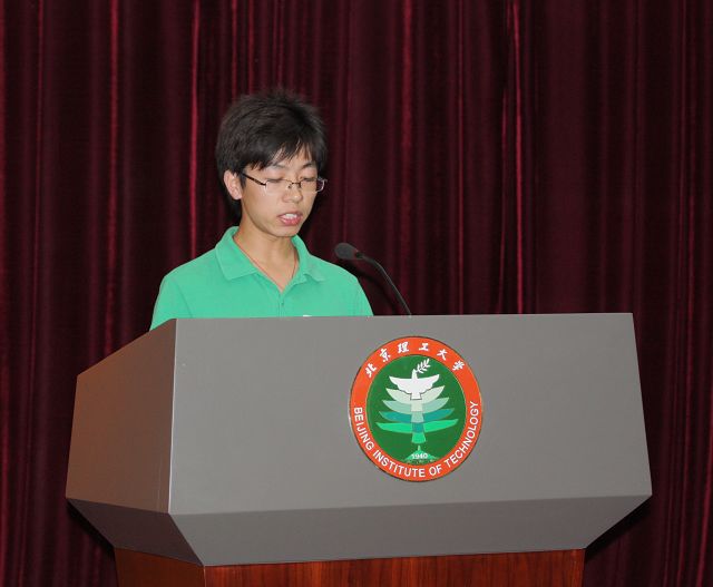 荣获北京理工大学优秀毕业生荣誉称号的冯玖江同学根据自己大学生活的体会对学弟学妹提出了几点建议:要学会理解和包容、做人要真诚;珍惜时光、努力学习;多关注国家的发展;要用积极的心态来面对自己的大学生活。他的发言赢得了新生一阵阵热烈的掌声。