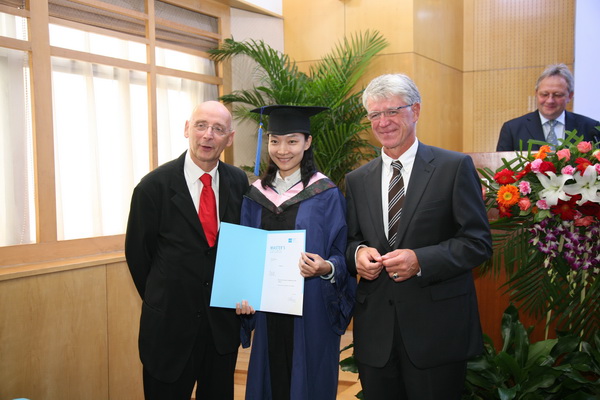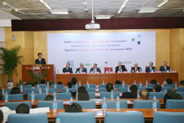 2012年9月7日下午,在我校国际教育交流大厦三层报告厅隆重举行我校与德国康斯坦斯应用科学大学合作为国际著名奔驰汽车生产商戴姆勒公司举办的EMBA项目第四期毕业典礼暨第六期新生开学典礼。出席典礼的嘉宾有:北京理工大学副校长孙逢春教授、戴姆勒东北亚地区首席财务官Helmut Ruhl先生、戴姆勒东北亚投资有限公司执行副总裁Matthias Zeuch先生、因戈尔斯塔特应用科学大学Thomas Doyé教授、康斯坦斯应用科学大学Josef Wieland教授、康斯坦斯应用科学大学继续教育部部长Roland Luxemburger先生、我校国际教育合作处王庆林处长、国际教育合作学院梅文博院长、罗佳书记、第四期全体学员和第六期新学员。典礼由梅文博教授主持。