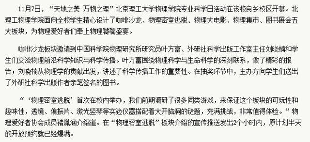 11月7日,“天地之美 万物之理”北京理工大学物理学院专业科学日活动在该校良乡校区开幕。北理工物理学院面向全校学生精心设计了咖啡沙龙、物理密室逃脱、物理大电影、物理集市、图书展会五大板块,为物理爱好者们奉上物理饕餮盛宴。