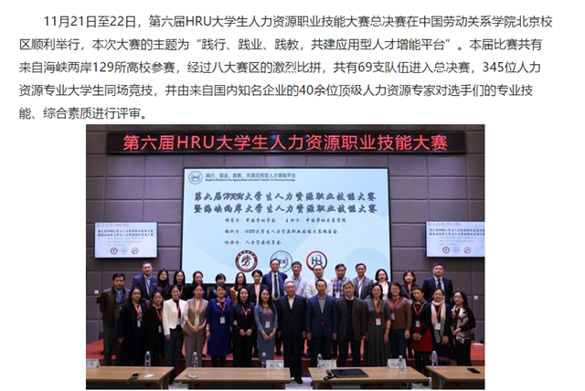 11月21日至22日,第六届HRU大学生人力资源职业技能大赛总决赛在中国劳动关系学院北京校区顺利举行,本次大赛的主题为“践行、践业、践教,共建应用型人才增能平台”。本届比赛共有来自海峡两岸129所高校参赛,经过八大赛区的激烈比拼,共有69支队伍进入总决赛,345位人力资源专业大学生同场竞技,并由来自国内知名企业的40余位顶级人力资源专家对选手们的专业技能、综合素质进行评审。