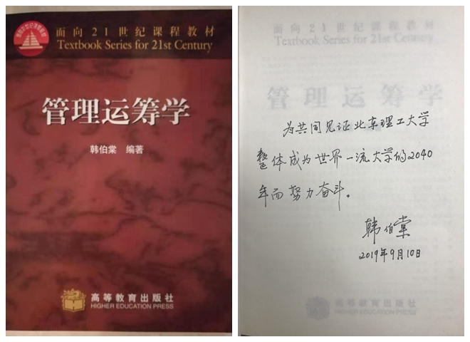 1977年国家恢复高考,韩伯棠考入延边大学,1982年又成功考入北京工业学院(现北京理工大学),在这里他先后以优异的成绩获得了理学硕士和博士学位。“1988年,我博士毕业的时候,学校正好更名为北京理工大学,我也有幸荣获了第一届徐特立奖学金。在北理工学习生活,最大感触就是学校那种为国家默默奉献,从延安传承的红色基因始终没有变。我的导师孙树本先生就是这样一位‘传承者’。孙老师学术和教学造诣很高,他曾在西南联大任教,也是北理工应用数学系和应用数学专业的创建者之一,是一位有影响的数学家。不是单纯的宣讲知识,而是注重引导我们向知识的纵深处探索,他的课堂总是引人入胜。当时70多岁的孙老师,还特别注重与学生的互动交流,这让我受益匪浅。”毕业后的韩伯棠有幸成为一名北理工教师。“联系过去,展望未来,才可使学者有灵活运用的能力”,孙树本先生的教诲以及言传身教,令韩伯棠至今铭记。