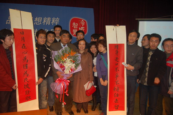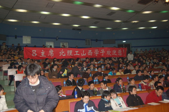在北京理工大学学习的山西学子得知吕主席要来我校演讲的消息后,在老乡间相互转告,并派代表早早的到来会场支持他们心目中的好领导。他们在会场打出了“吕主席,北理工山西学子欢迎您”的横幅,并在讲座开始前,选派代表为吕主席献上了鲜花和他们事先准备好的礼物——一幅为吕主席书写的对联。上联是“日月在心为国为民披肝胆”;下联是“周身是口不争不辩任去留。”用以表达山西学子对吕主席的敬意。