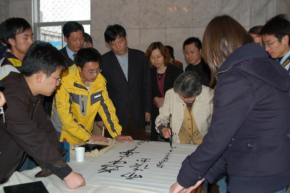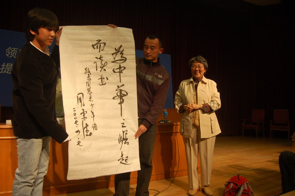 在讲座开始前,周秉德老师当场挥毫,为我校同学题写了周总理年轻时的一句话“为中华之崛起而读书”,送给理工学子,她希望同学们能秉承总理的意愿,为了中华民族的伟大复兴而努力学习科学文化知识,努力掌握先进的技术,努力奋斗成为祖国需要的栋梁之材。
