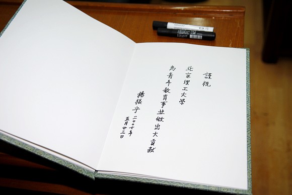会谈中,杨振宁先生兴致勃勃地为我校题词:谨祝北京理工大学为青年教育事业做出大贡献。