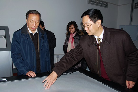 资料图片:王涌天教授(右)在向教育部领导汇报科研新成果。