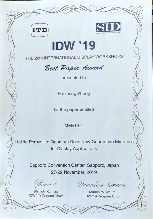 北理工钟海政教授获得日本IDW 2019显示会议最佳论文奖
